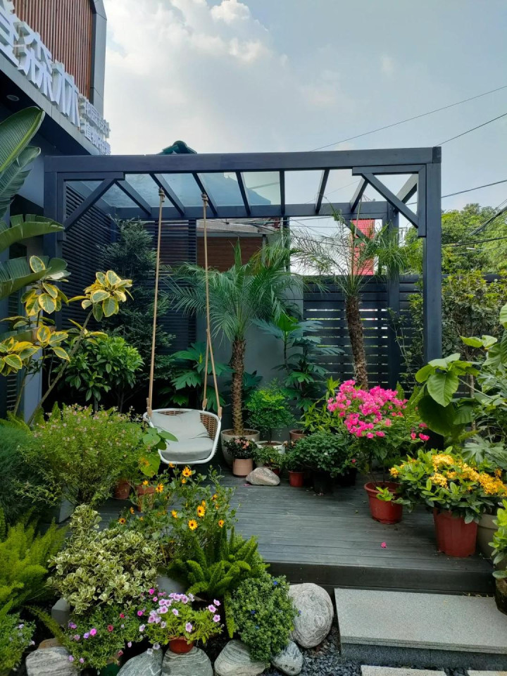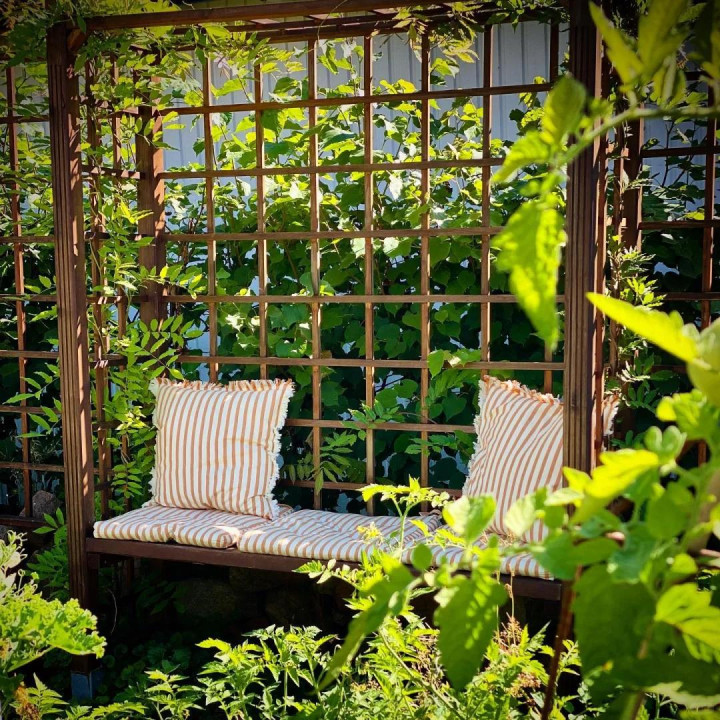 无论是让爬藤月季、铁线莲肆意蔓延,还是错落摆放几盆心爱的盆栽,一个花架,立刻让院子有了视觉焦点。