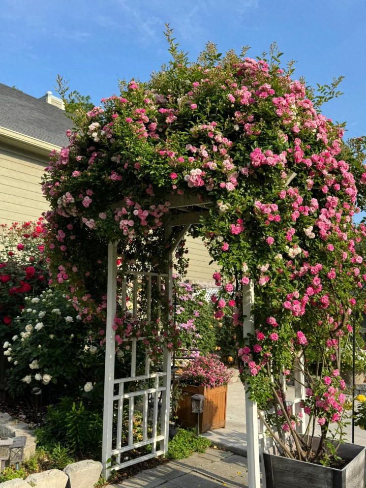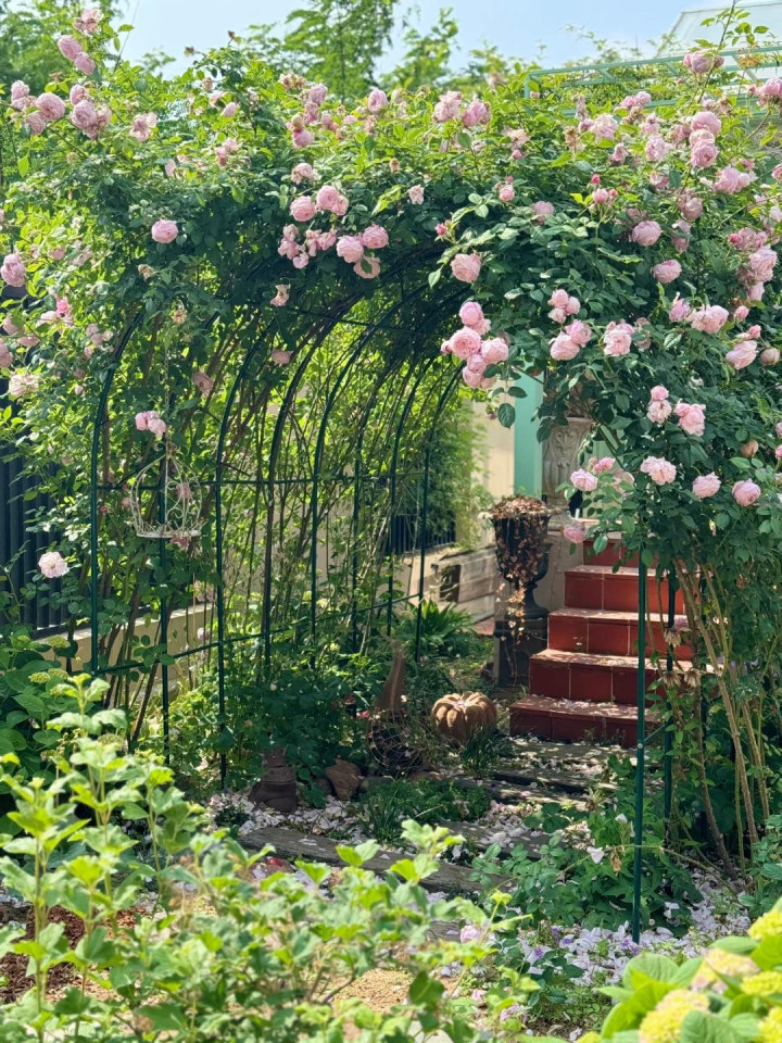 直到某天,路过邻居家,一抬眼——一架木色花架,爬满月季与紫藤,风一吹,花影摇曳,连空气都甜了。